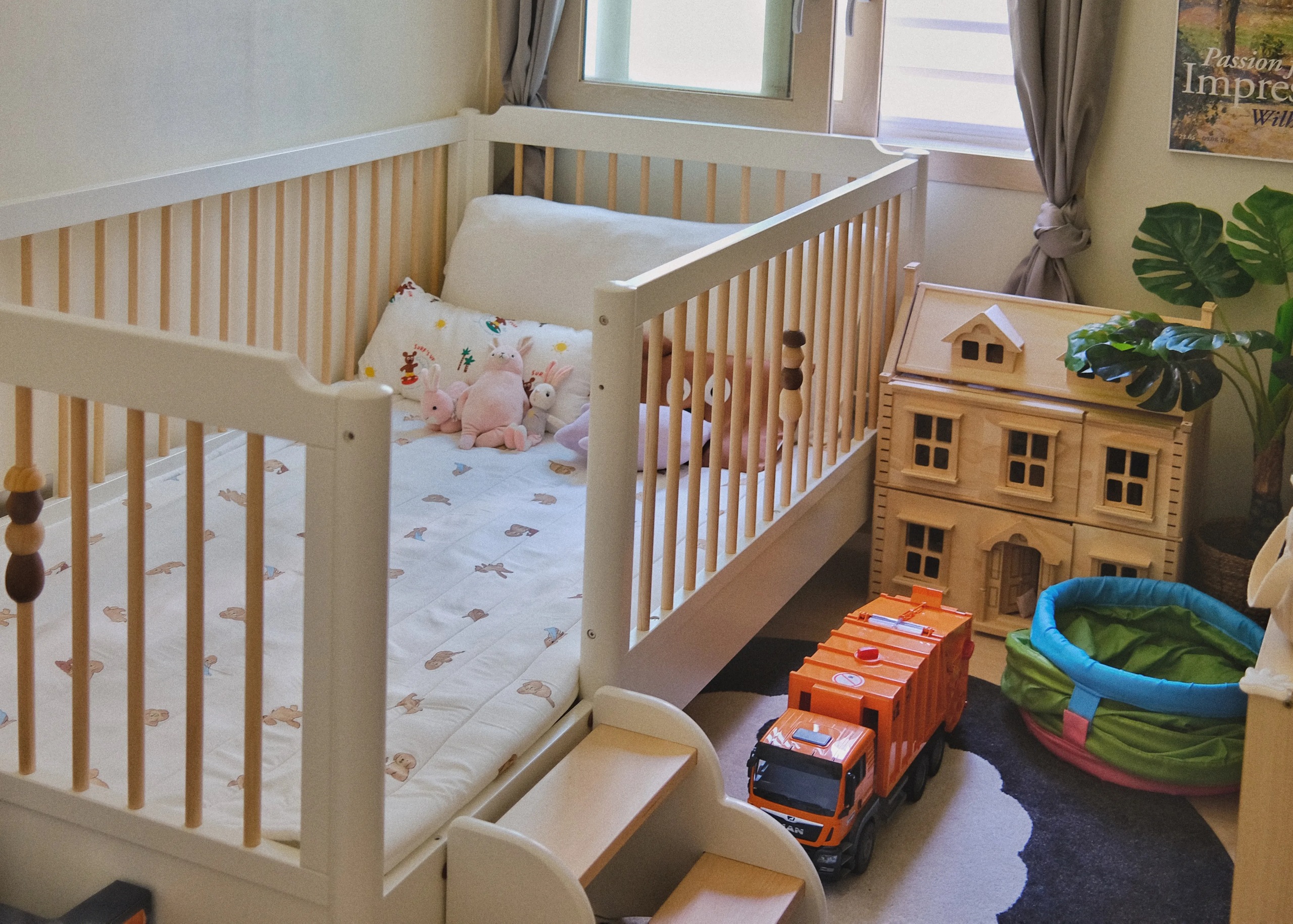 입구만 빼고 가드되어 있기 때문에 뒤집기를 시작한 아이에게 꼭! 필요한 침대입니다.아기가 사용하기 때문에 친구를 살 때 고민을 많이 하는데, 레이디 가구의 렙데이 침대는 자재 등급이 E0이래요.